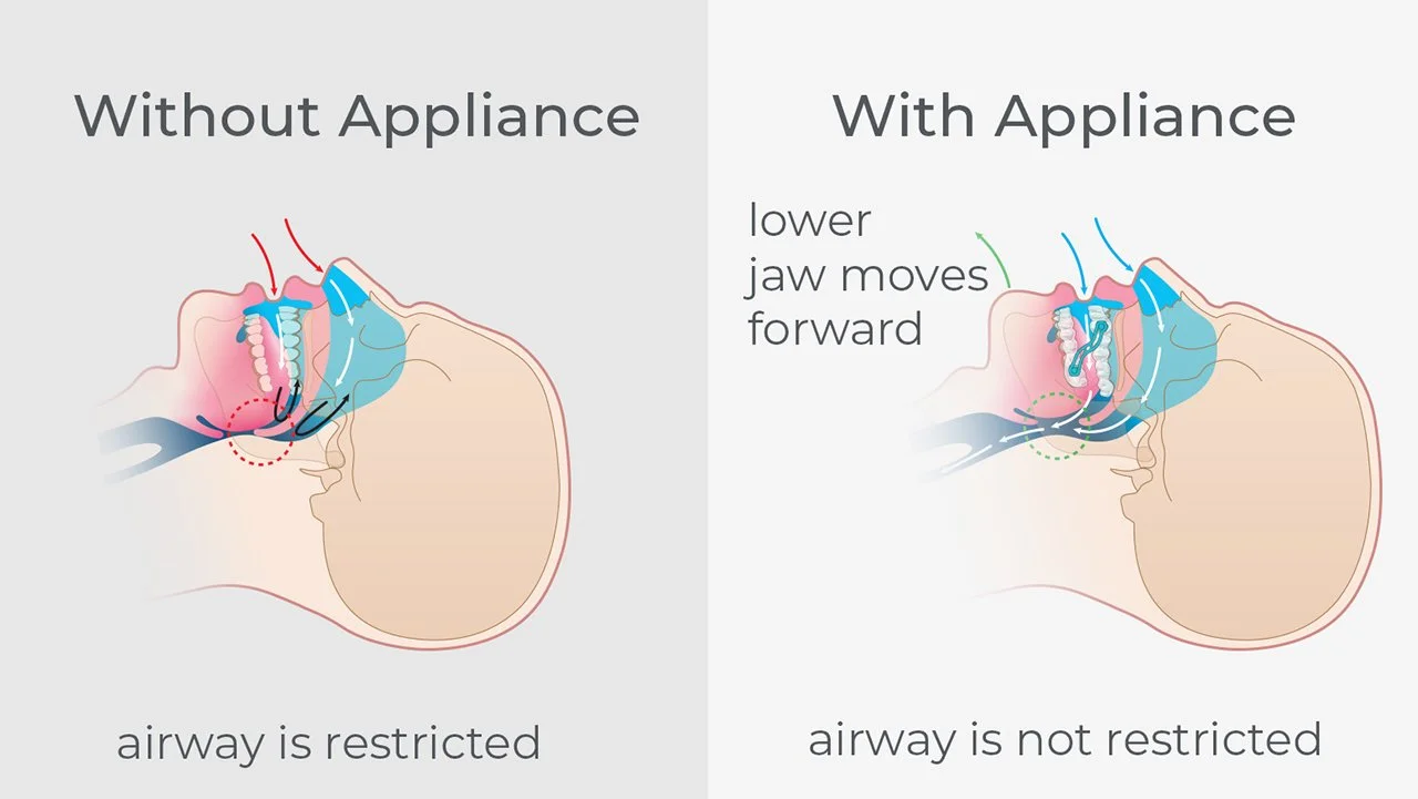 By holding the lower jaw forward, your tongue is no longer able to fall back and create the narrowing of the airway, which creates the audible sound of snoring.